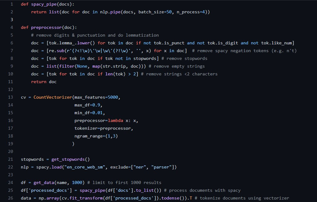 We also remove a total of 1,192 stopwords from the text. This list is composed of Scikit-learn’s English stopword list [9], the list of scientific stopwords curated by Seinecle [10] and a list of stopwords we added ourselves. Lastly, we exclude any terms that occur in more than 90% of documents as well as those that occur in less than 1% of documents.To efficiently preprocess the data we start by putting all documents through Spacy’s pipe functionality and then subsequently tokenise the data by putting it through our custom preprocessor function. We provide a custom preprocessor function to the Countvectorizer to ensure the object works well with the output of Spacy. The code shows the functions used to execute all of these steps: