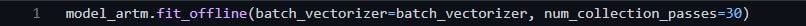 Now that we have our preprocessed data in BOW format we can almost train our topic model. Initialising an ARTM model requires the data to be divided into batches and requires the user to specify the amount of desired topics. This is not desirable for live topic modelling and later we will explain how we tackled this problem. For now, the ARTM model is initialised as follows: