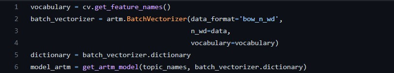 Our method of choice is the Additive Regularisation of Topics Models (ARTM) model from the paper “Tutorial on Probabilistic Topic Modelling: Additive Regularisation for Stochastic Matrix Factorisation” [4]. The model has an implementation on Github as a python module [5]. The library also has a Latent Dirichlet Allocation [6] implementation in case you want to compare how it fares up against the ARTM model. The difference between ARTM models and the former two methods is that it does not make any probabilistic assumptions about the data. Instead, ARTM adds weighted sums of regularisers to the optimisation criterion which are differentiable with respect to the model.